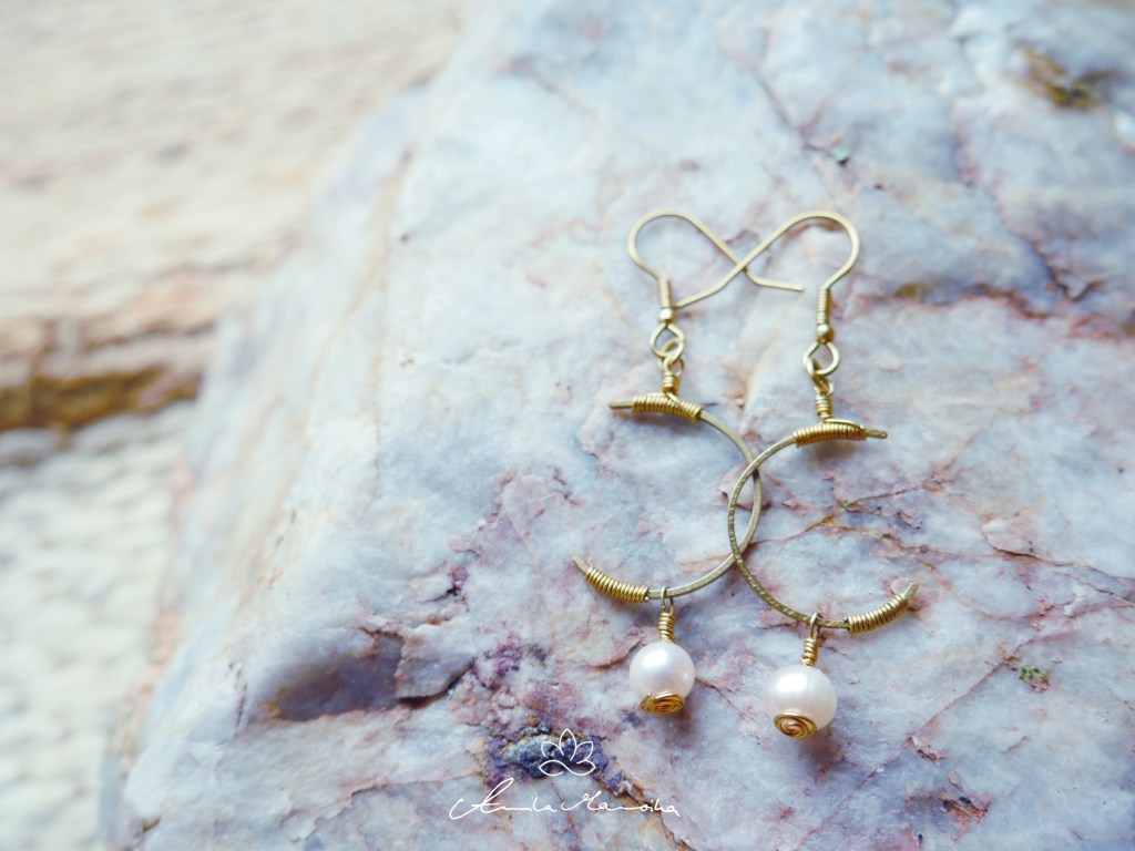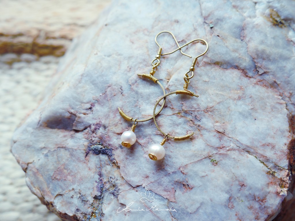 Handmade with love! Beautiful elegant brass half hoop earrings handmade with golden wire and two white freshwater pearls in size of 6mm. All items are nickelfree.