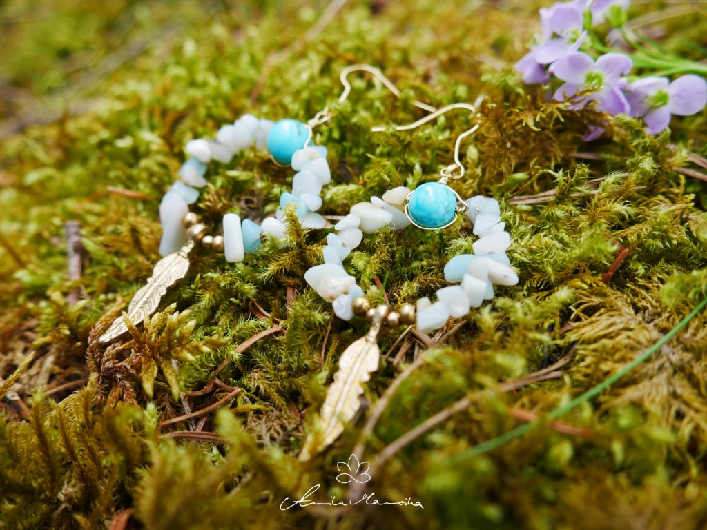 Aquamarin loops with a beautiful 6mm turquoise pearl & brass feather. All items are nickelfree.
