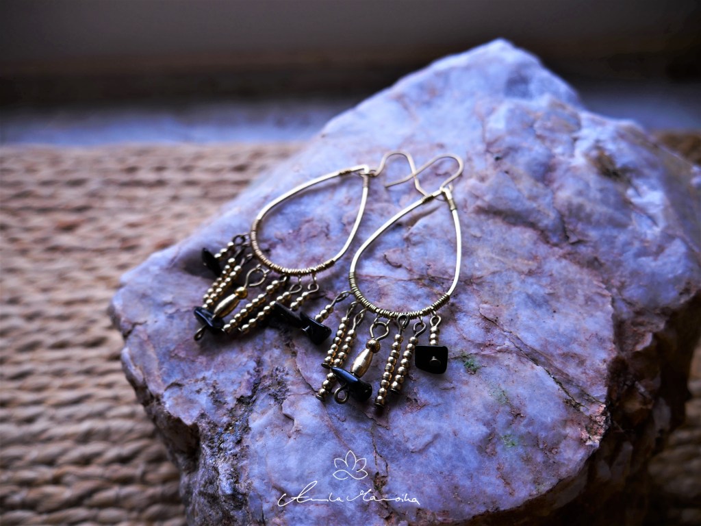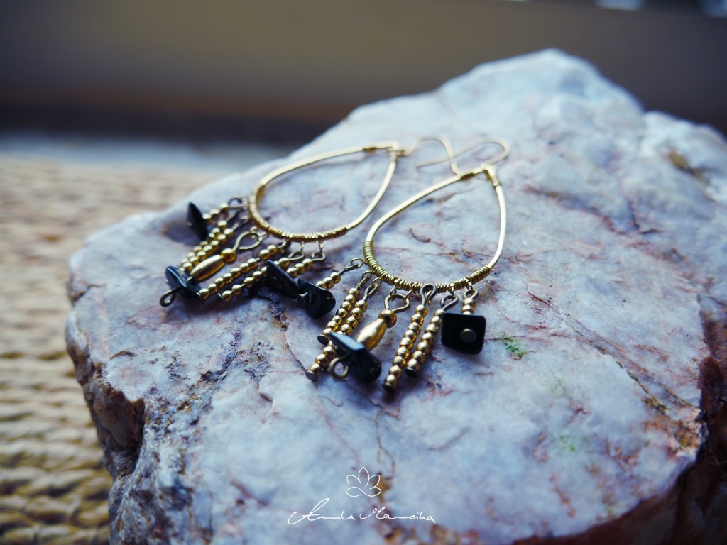 Simple and powerful brass hoops with natural formed black jade stones. All items are nickelfree.
