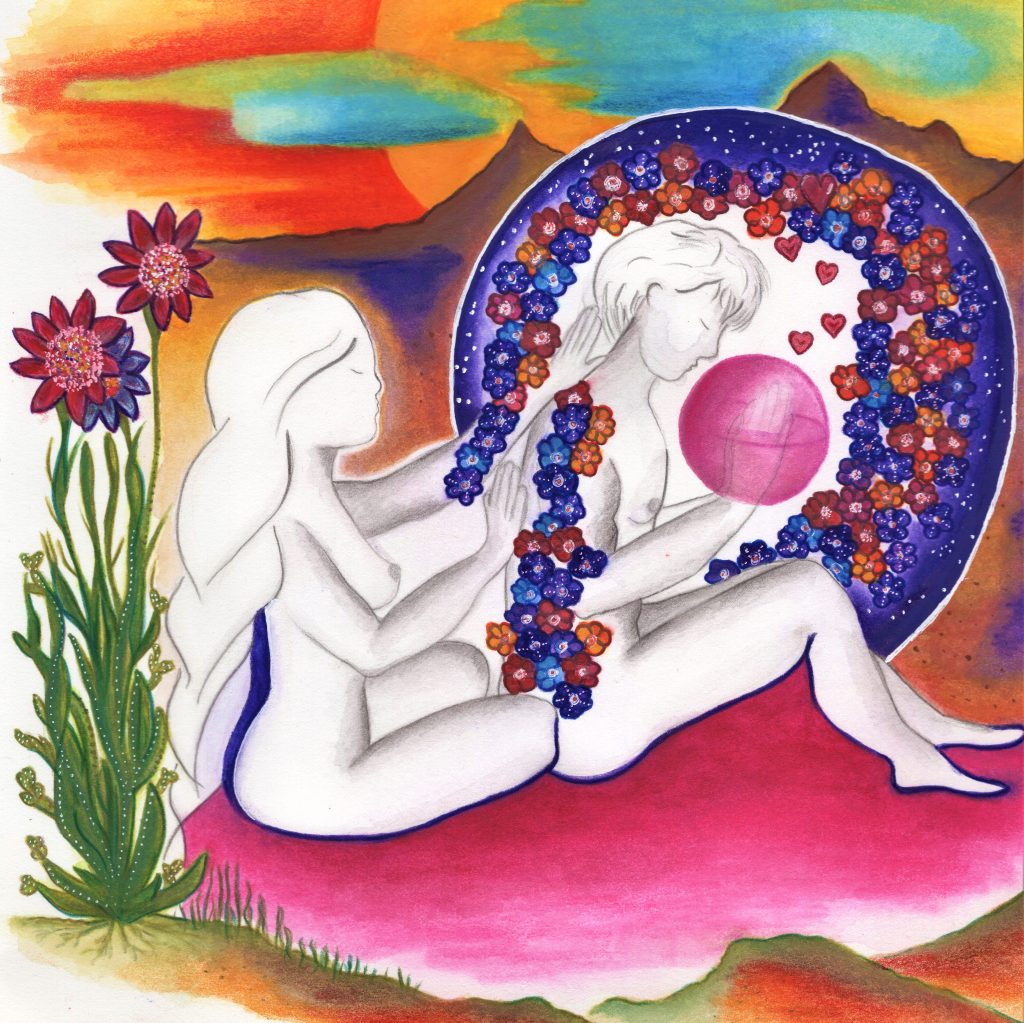 Powerful energy arises when we hold space for each other. The soul can grow and reflect in its individual way. The masculine energy is changing. Holding space for it and allowing the masculine to rise in its own steps feels beautiful. It can be felt as a couple and also within yourself. Space and silence embraces holy divine energy to serve the soul with comfort and pure love. It opens a channel for abilities in the inidividual which weren´t felt before. The trinity of being connects. Spirit, body and soul. The drawing and its energy shall remind you that holding space in our heart empowers the highest soul purpose of yourself – always in the Now.